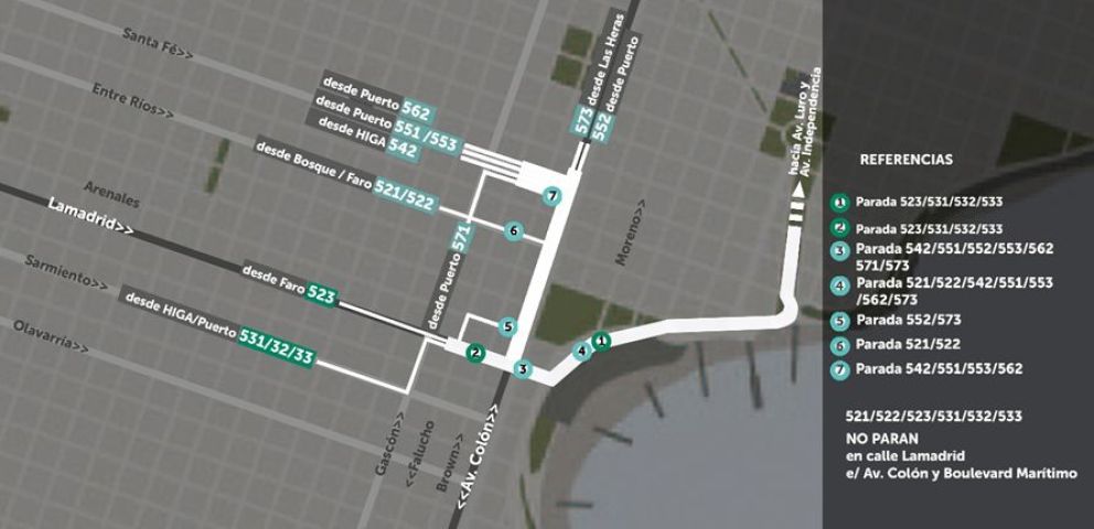 En la otra zona, comprendida por el tramo de calle Lamadrid que se extiende desde Avenida Colón hasta Boulevard Marítimo, la reestructuración consiste en la eliminación de las paradas de las líneas 521, 522, 523, 531, 532 y 533 en la calle Lamadrid entre la avenida Colón y el Boulevard Marítimo que se trasladan al Boulevard frente a la Plazoleta Almirante Brown.