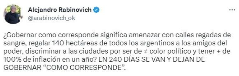 Las expresiones electorales de los referentes del Frente de Todos rápidamente tuvieron una respuesta por parte de la oposición, por lo que Rabinovch posteó desde su red social: ¿Gobernar como corresponde significa amenazar con calles regadas de sangre, regalar 140 hectáreas de todos los argentinos a los amigos del poder, discriminar a las ciudades por ser de ≠ color político y tener + de 100% de inflación en un año? EN 240 DÍAS SE VAN Y DEJAN DE GOBERNAR “COMO CORRESPONDE”.