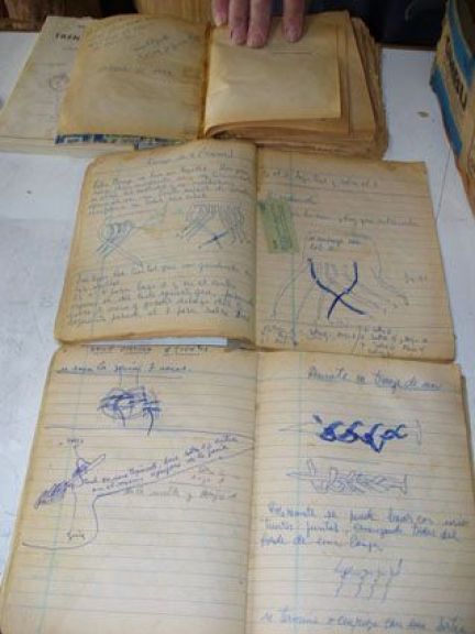 “ En esa época, década del 70, con mi señora y mis hijos vivíamos en un rancho en el campo. No teníamos electricidad, por lo que nos alumbraba un farol a querosén o velas. Así que me copié casi todo el libro en dos cuadernos “Efemérides” a mano. Estuve durante 25 días haciendo los dibujos y transcribiendo las indicaciones que me servían para aprender. El libro me lo había prestado el vasco Domingo Izurieta, así que una vez que lo copié se lo devolví y le regalé una botella de caña en agradecimiento.”