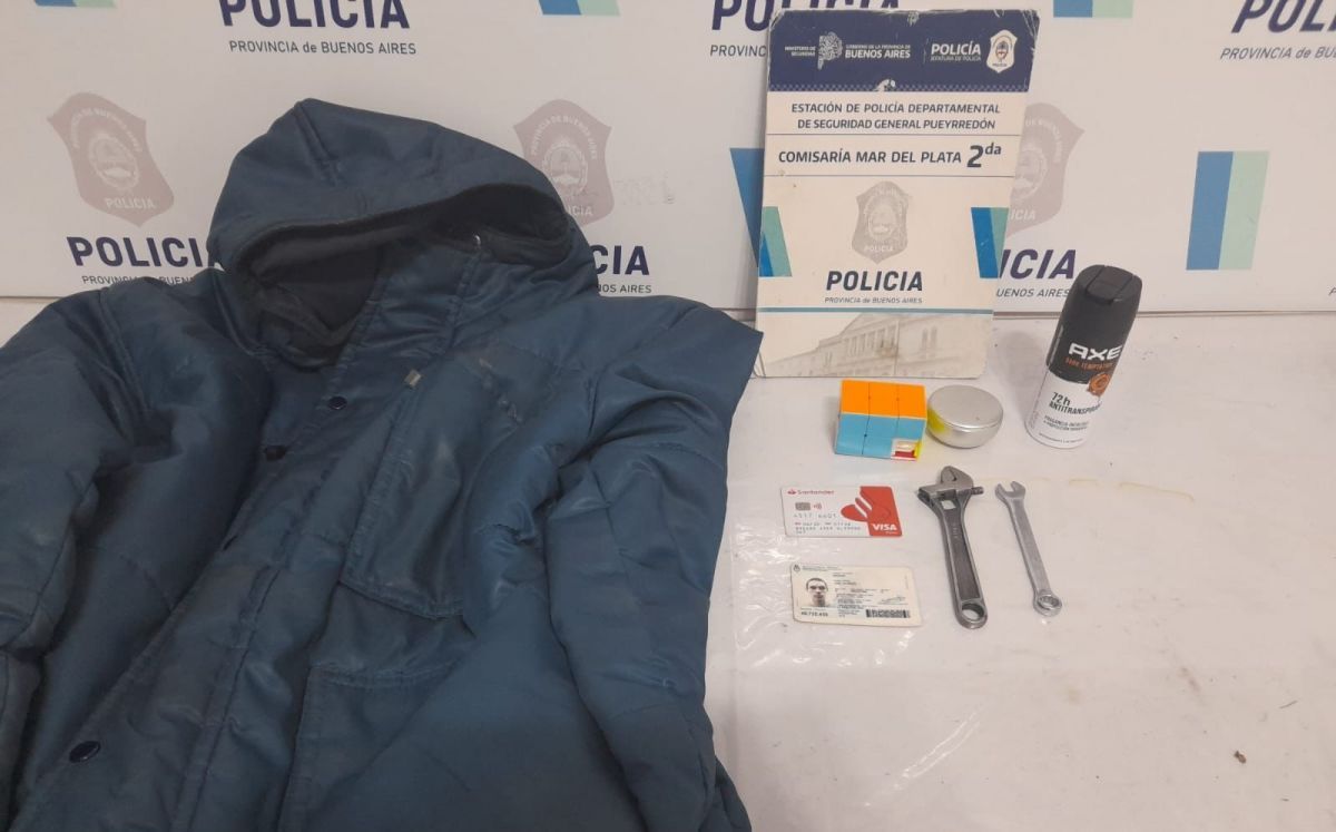 Seguidamente, los efectivos aprehendieron a un joven de 21 años que se encontraba en esa zona y tenía consigo una campera; un desodorante; auriculares; un cubo Rubik; DNI y tarjeta de débito perteneciente a la víctima y dos llaves francesas.