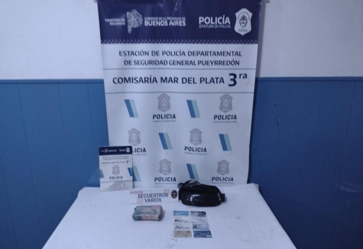 Con las características aportadas por el testigo los efectivos salieron en su búsqueda logrando la aprehensión de un joven de 23 años a pocos metros. Este sujeto llevaba consigo una riñonera que contenía una billetera, DNI, tarjetas de crédito, credencial de Obra Social y Licencia de Conducir a nombre de una mujer de 23 años, la cual fue contactada de forma inmediata.
