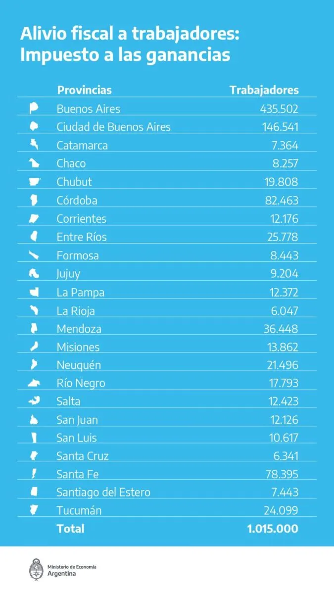 Además, el titular de la cartera económica indicó que, para sostener una mejor progresividad del impuesto, "incrementamos las escalas en un 35% retroactivo a enero de este año, reduciéndolo a 715.000 personas". En los meses en que la remuneración bruta del mes supere los $700.875 y resulte inferior o igual a $808.101, los agentes de retención computarán una deducción especial incrementada.