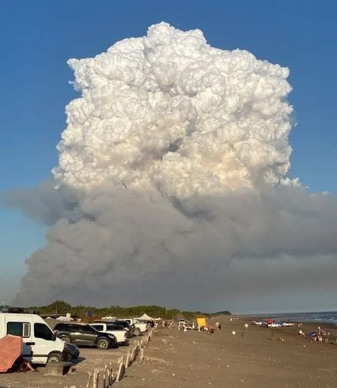 Varias dotaciones de bomberos siguen trabajando en los establecimientos rurales Moromar y La Mora, cercanas al Balneario Arenas Verdes. Visto desde allí, la columna de humo parecía la erupción de un volcán.