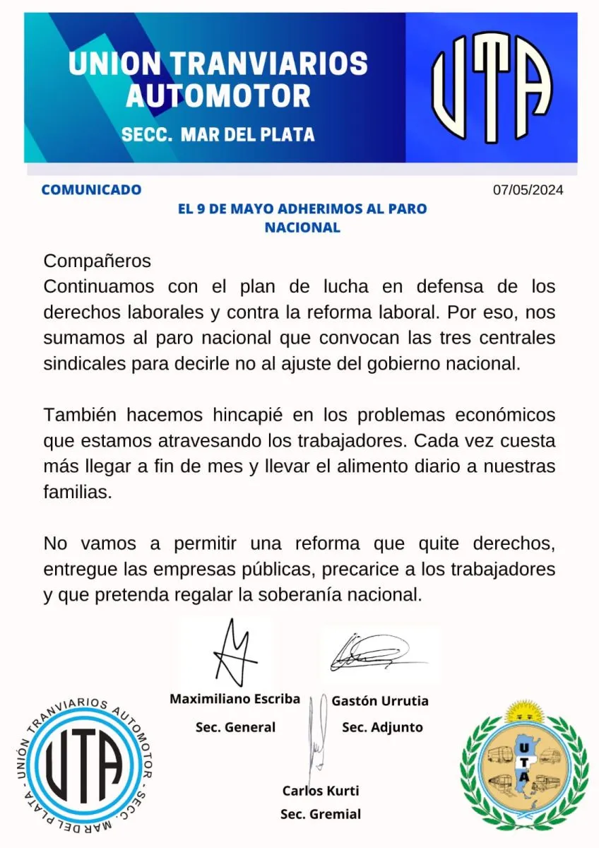 La UTA seccional Mar del Plata confirmó su adhesión al paro de la CGT y por lo tanto este jueves 9 de mayo no habrá colectivos en la ciudad. "Continuamos con el plan de lucha en defensa de los derechos laborales y contra la reforma laboral", expresaron desde el gremio.