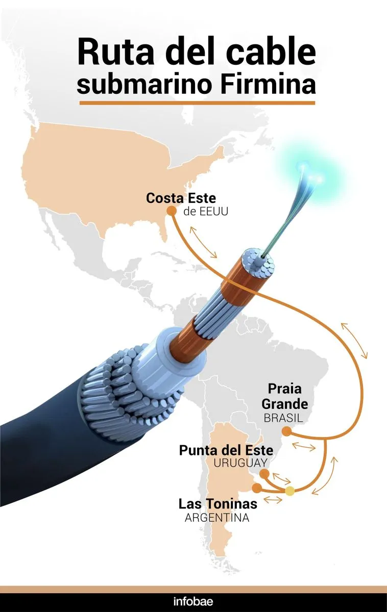 El cable, llamado Firmina tiene unos 13.500 kilómetros de extensión, incluyendo cinco segmentos para el trayecto principal y dos derivaciones en sus diseños: también desembarcó en Praia Grande, en San Pablo (Brasil) y en la ciudad uruguaya de Punta del Este. Es actualmente el cable de fibra óptica más largo del mundo.