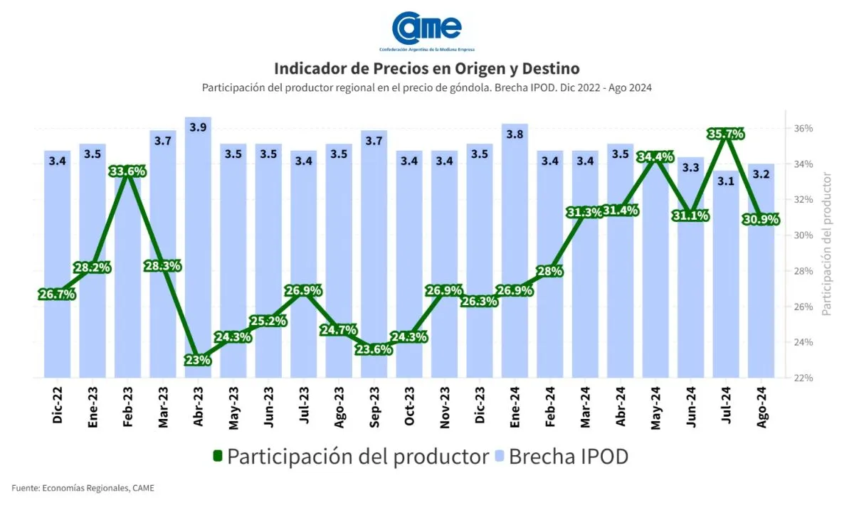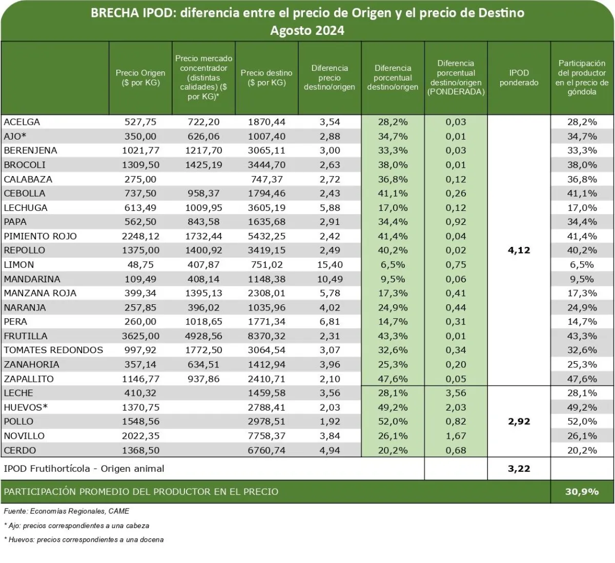El dato se desprende de un informe publicado por el sector de Economías Regionales de la Confederación Argentina de la Mediana Empresa (CAME). Según el reporte, en agosto de 2024 los precios de los agroalimentos se multiplicaron por 3,2 veces del campo (origen) a la góndola (destino).