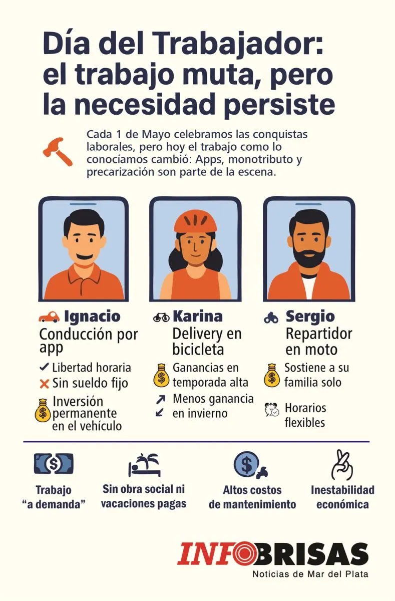 Desde InfoBrisas.com hablamos con trabajadores de aplicaciones de Mar del Plata: manejan autos, motos o pedalean por la ciudad todos los días, buscando una oportunidad en medio de una economía que no siempre los acompaña.