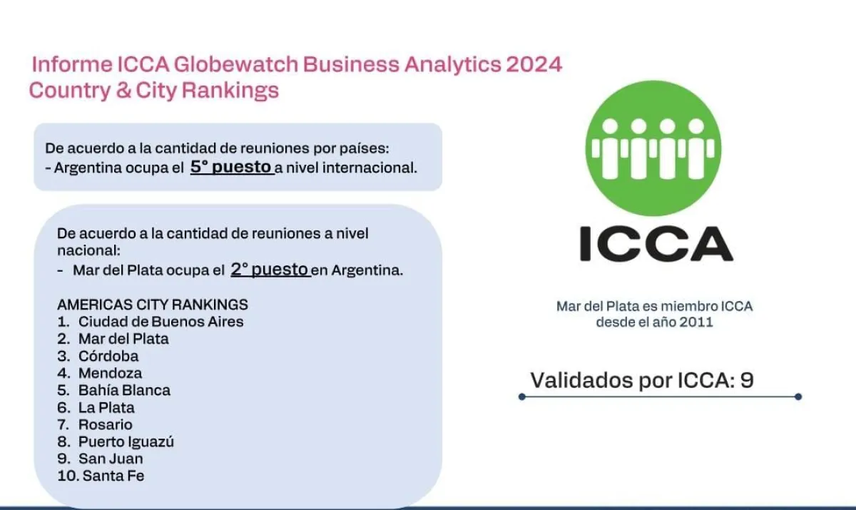 En ese marco, a las 12:30 de hoy (hora alemana) se anunció el Ranking ICCA (International Congress and Convention Association), donde Argentina se posicionó en el quinto puesto a nivel Latinoamérica. En el plano nacional, Mar del Plata fue reconocida como la segunda ciudad del país en organización de eventos internacionales, solo detrás de la Ciudad Autónoma de Buenos Aires: es decir, la primera del interior del país.