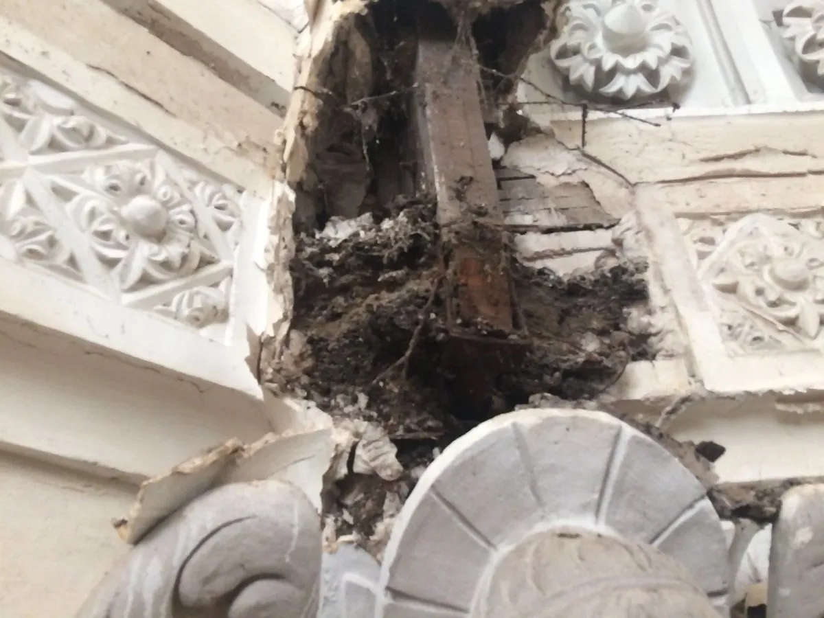 Las piezas que se cayeron corresponden a una cúplula en forma de arco recubierta con una superficie similar que la hace similar a piedra. Reconoció que incluso es difícil disponer de mano de obra especializada, en particular yeseros que ya casi no hay en el mercado laboral.