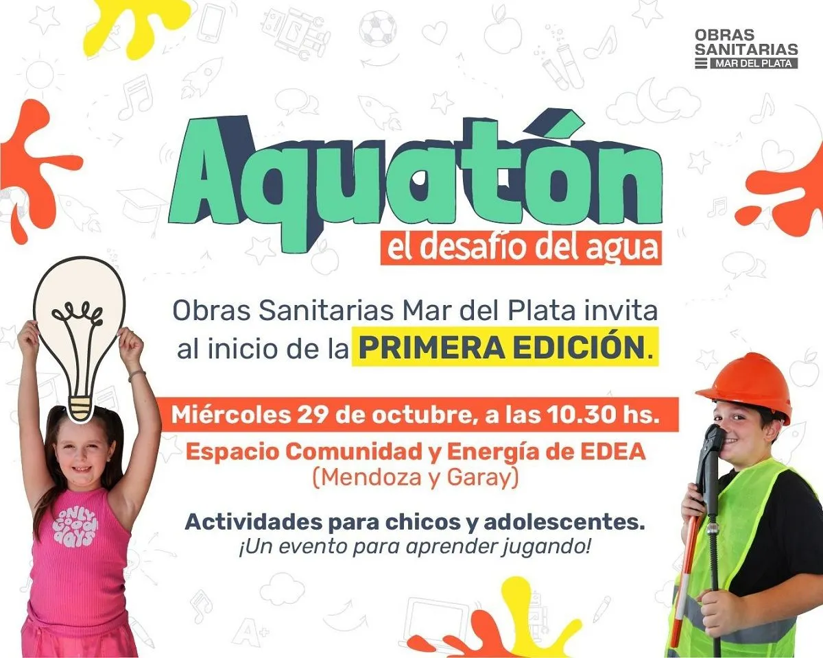 Obras Sanitarias Mar del Plata (OSSE) lanza la primera edición del Aquatón, un evento que busca fomentar el cuidado del agua y el uso responsable de los servicios sanitarios entre niños y adolescentes.