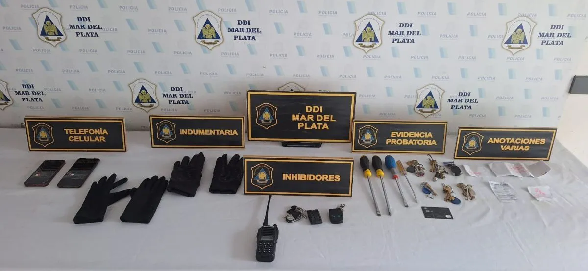 Durante el operativo se incautaron tres inhibidores, un Renault Sandero, teléfonos celulares, juegos de llaves, guantes y herramientas.