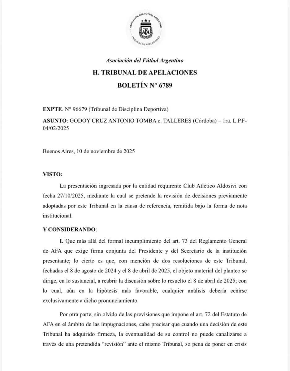Aldosivi había realizado una presentación ante la AFA solicitando que se revea el fallo que le había devuelto a Godoy Cruz los seis puntos quitados por los incidentes frente a San Lorenzo en 2024 y contra Talleres en 2025.