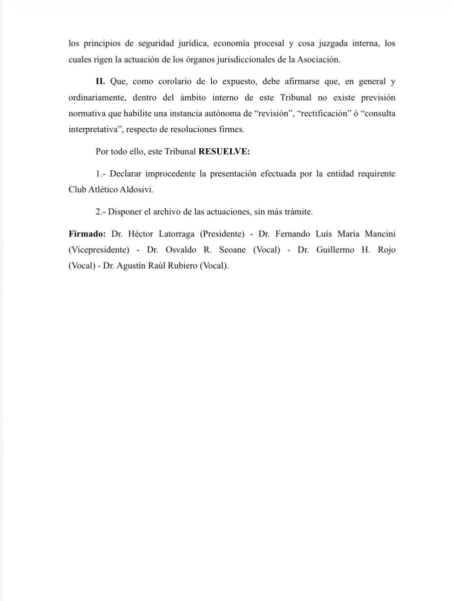 Este lunes el Tribunal de Apelaciones le respondió al club marplatense y fue categórico. Se resolvió "declarar improcedente la presentación efectuada por la entidad requirente Club Atlético Aldosivi", y "disponer el archivo de las actuaciones, sin más trámite".
