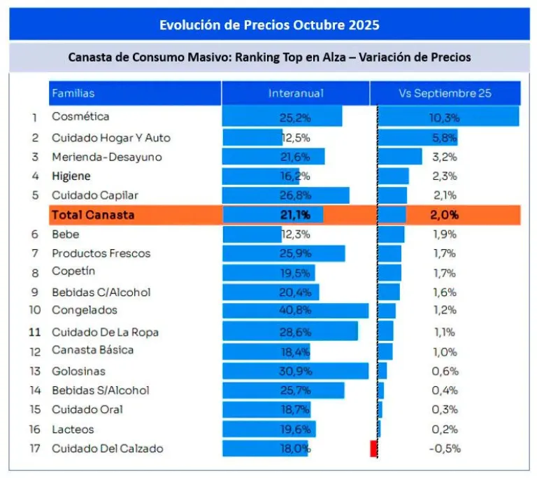 Las categorías con mayores incrementos: Cosmética: +10,3%, Cuidado del Hogar y Auto: +5,8%. y Merienda y Desayuno: +3,2%.