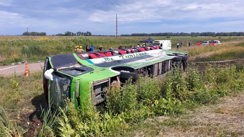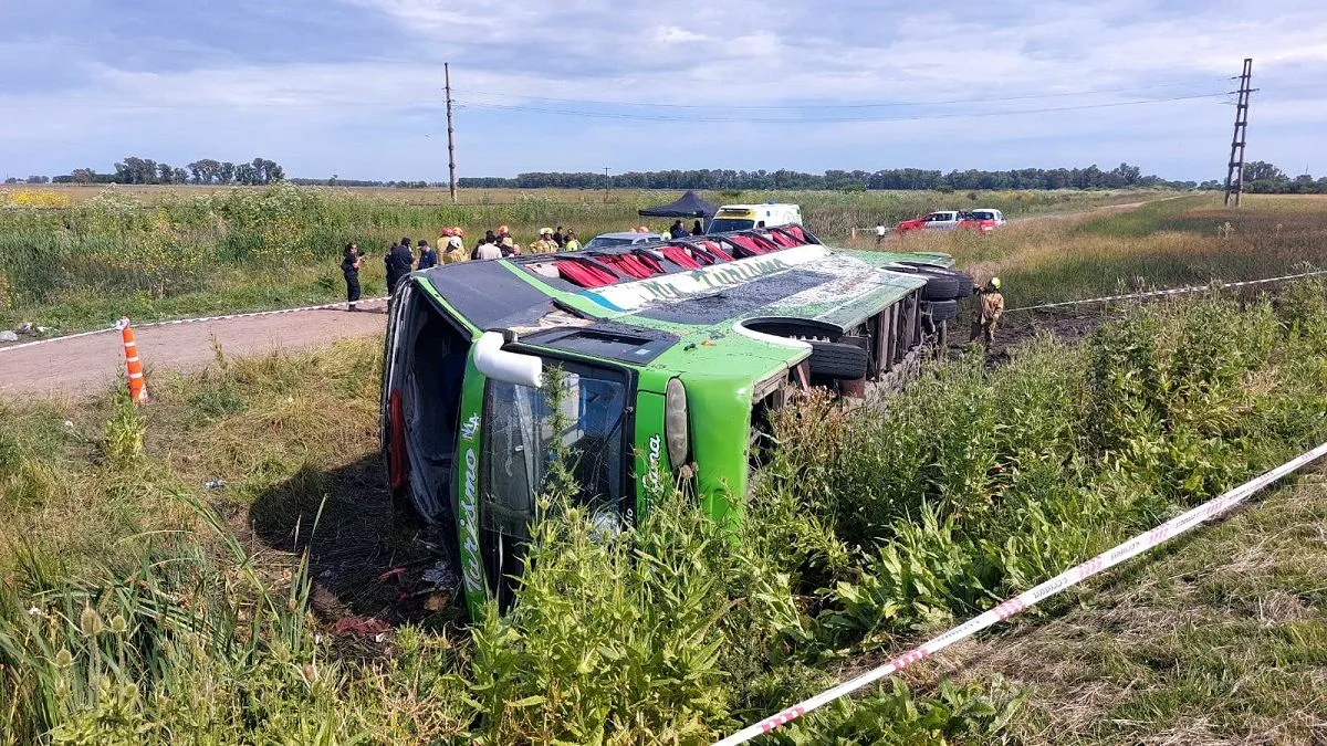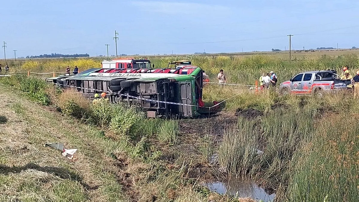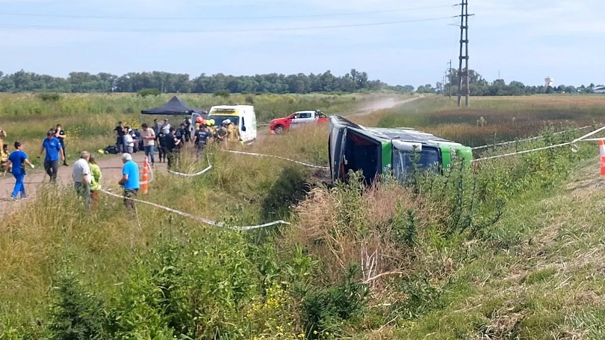 De acuerdo al relato del móvil, el vehículo “siguió de largo en la curva” y terminó volcado sobre su lateral en una banquina, dentro de un zanjón de tres metros de profundidad. La parte superior del micro quedó torcida en un ángulo aproximado de 30 grados, lo que evidencia la violencia del impacto.