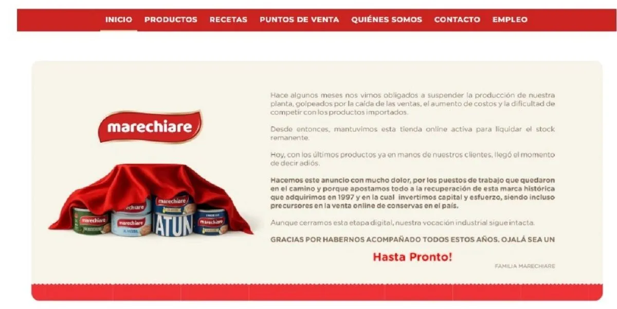La histórica empresa de conservas Marechiare confirmó el cierre de su tienda online, el canal que había mantenido activo en los últimos meses para liquidar el stock remanente luego de frenar su producción.