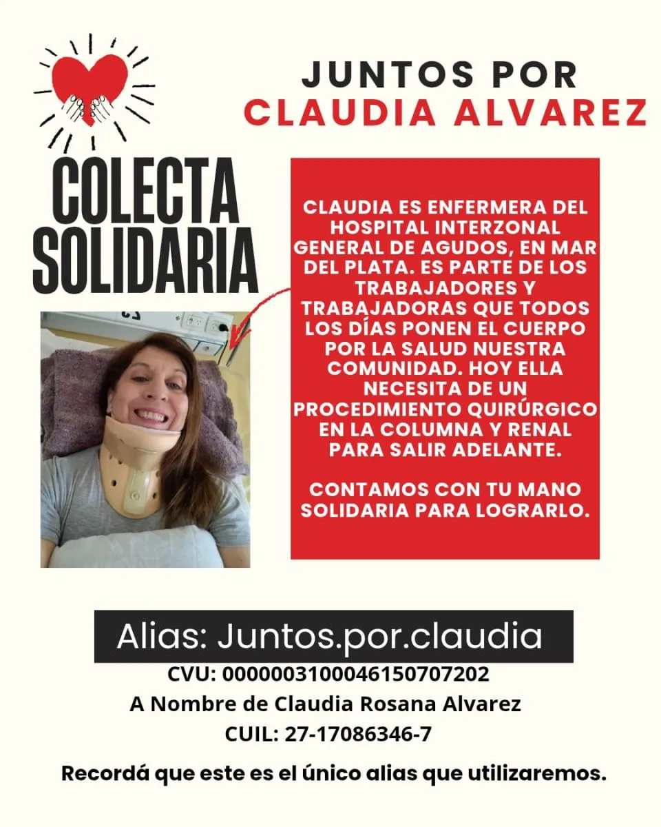 Compañeros, vecinos y organizaciones impulsan una colecta solidaria para acompañar a Claudia Rosana Álvarez, enfermera del Hospital Interzonal General de Agudos (HIGA), quien necesita someterse a dos intervenciones quirúrgicas, una de columna y otra renal, para continuar con su recuperación y mejorar su calidad de vida.