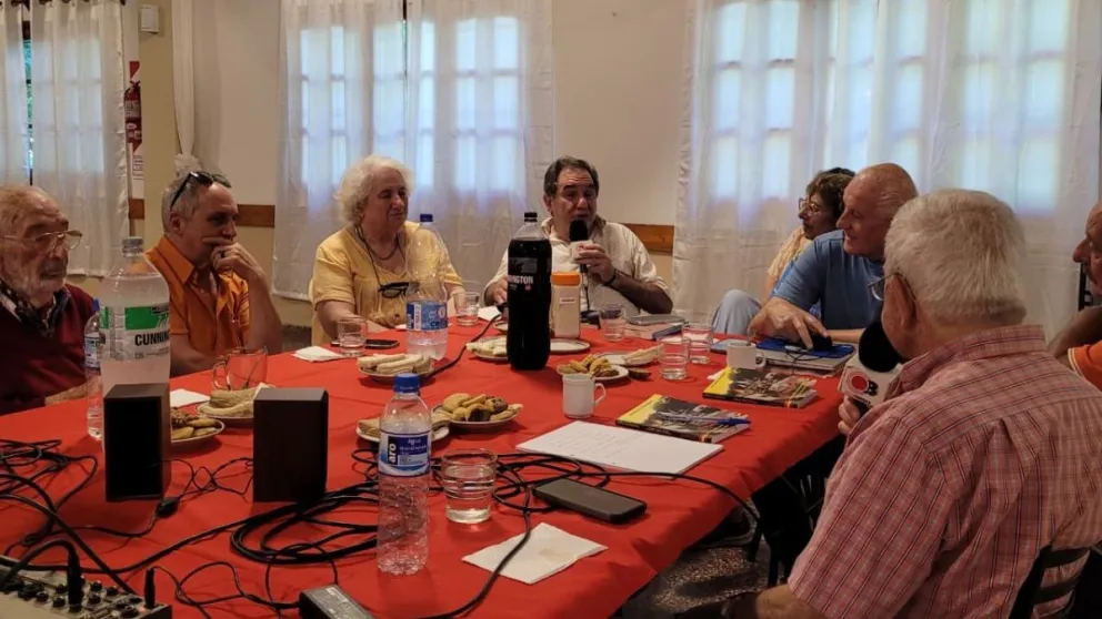 Durante la tarde de radio, Eduardo Zanoli y su equipo dialogaron con los presentes, entre los que se destacan Gloria Del Vechio, presidenta; Victor Lunazzi, vicepresidente; Rubén Peiro, socio desde hace 70 años; Olga Peluchí, socia vitalicia, y el historiador Jerónimo Boragina.