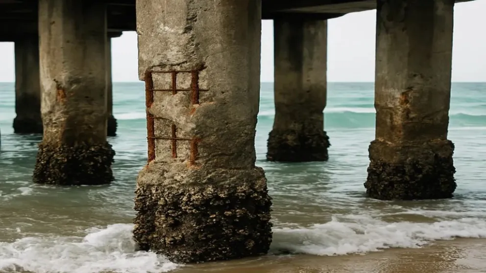 El principal factor de daño en estas zonas es la presencia de iones cloruro, que provienen del mar y avanzan lentamente hacia el interior del hormigón. “En ambiente marino, la principal causa de deterioro de las estructuras de hormigón armado es la corrosión iniciada por iones cloruro. Los iones cloruro penetran desde el exterior a través de la red de poros del hormigón”, detalló Vázquez.