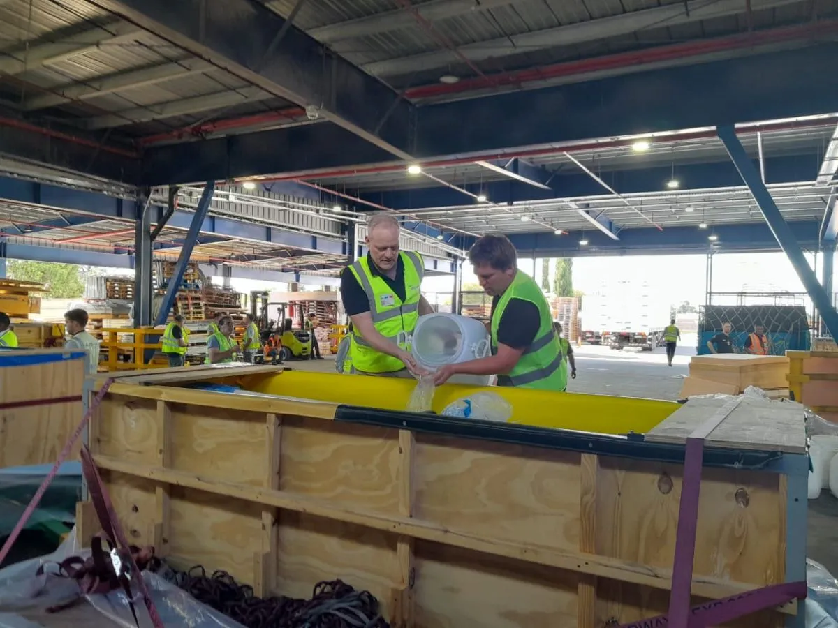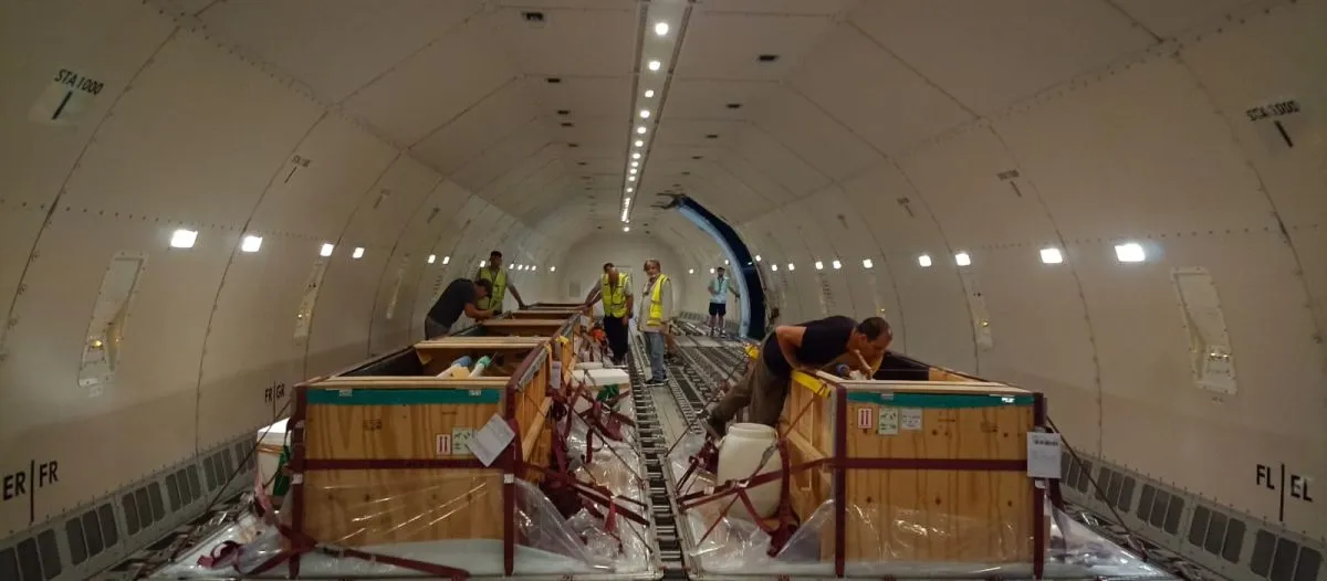 Desde Mar del Plata partieron en camiones hacia Ezeiza, donde se llevó a cabo la paletización de los contenedores antes de subirlos al avión. “Fue un trabajo enorme, con grúas, zampi, camiones internos y externos, y tiempos muy precisos para poder cumplir con los requerimientos del vuelo”, explicó el especialista.