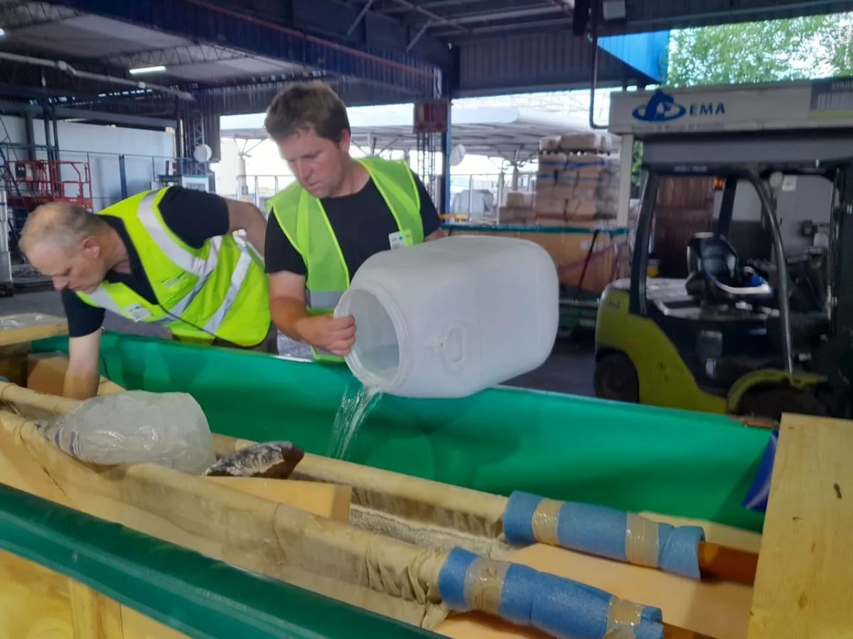 El proceso se inició en la noche previa, cuando los delfines fueron ubicados en sus contenedores especialmente preparados bajo normas internacionales IATA para el transporte de fauna.