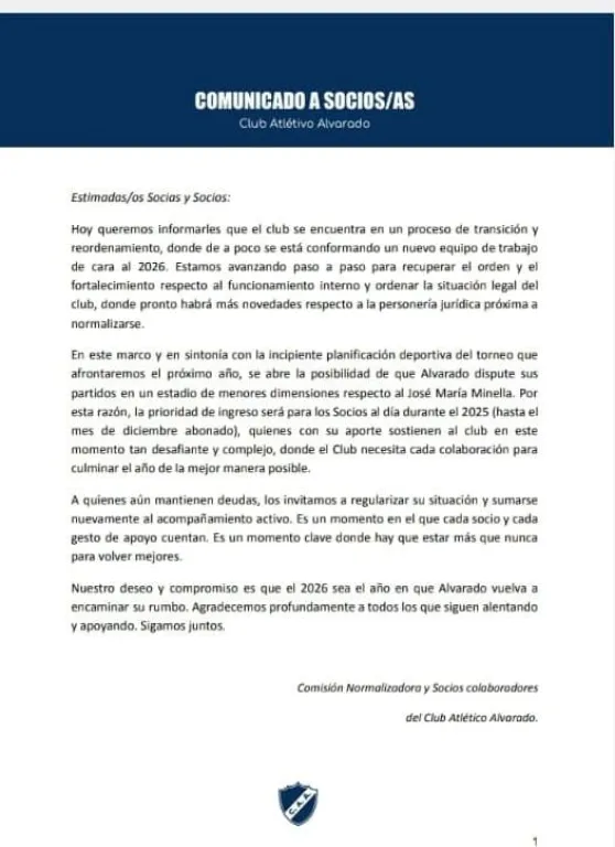Asimismo, hicieron un llamado a quienes aún tienen deudas a regularizar su situación y volver a sumarse activamente a la vida social y deportiva del club. “Es un momento en el que cada socio y cada gesto de apoyo cuentan. Ahora más que nunca necesitamos estar unidos para volver a encaminar a Alvarado”, expresaron.