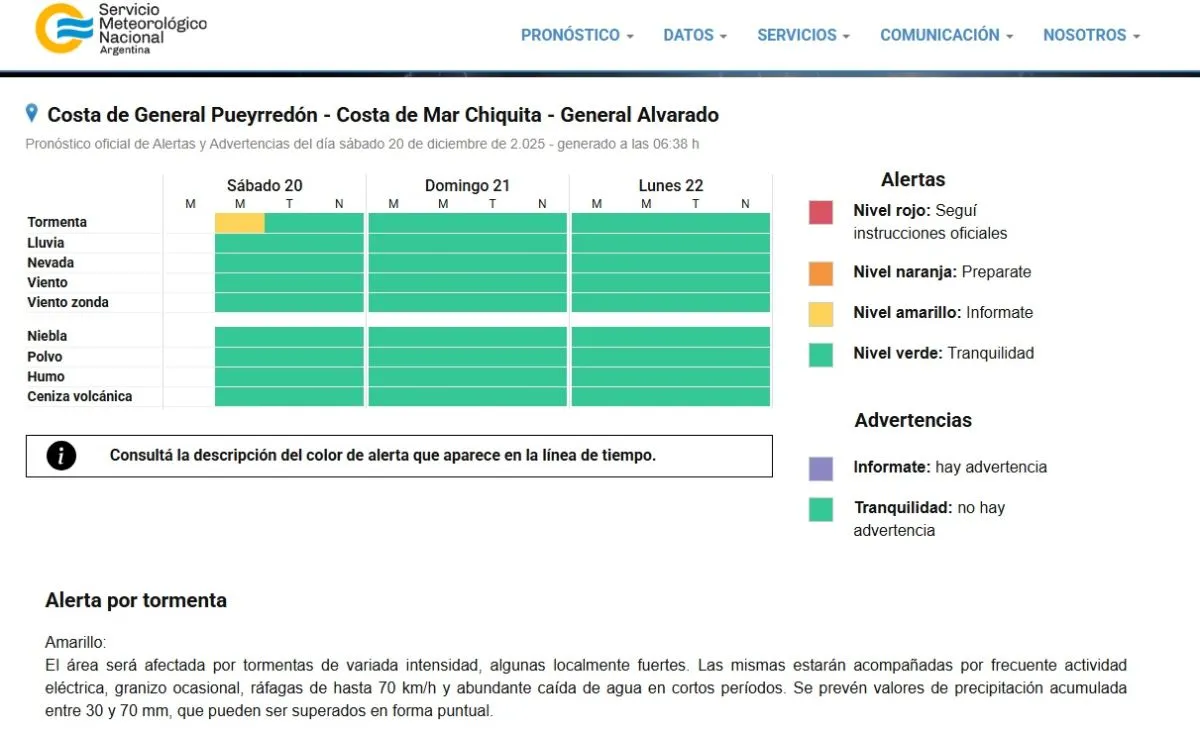 El SMN emitió una alerta amarilla en Mar del Plata por tormentas con lluvias intensas, ráfagas de hasta 70 km/h, actividad eléctrica y posible granizo.