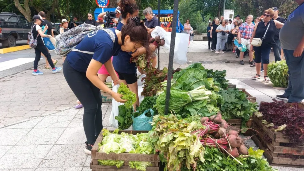 En un sector de Plaza San Martín se dispuso un gran puesto montado por productores frutihortícolas de la zona que llevaron adelante el "verdurazo", con bolsones de mercadería fresca a valores de 2.000 pesos destinados a jubilados.