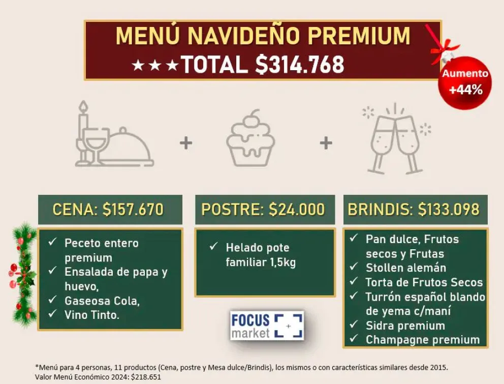 La cena de Nochebuena y Navidad vuelve a reflejar el complejo escenario económico. Según un informe elaborado por la consultora Focus Market, el Menú Navideño 2025 mostró incrementos interanuales de hasta 44%, con fuertes diferencias según el nivel de consumo elegido.