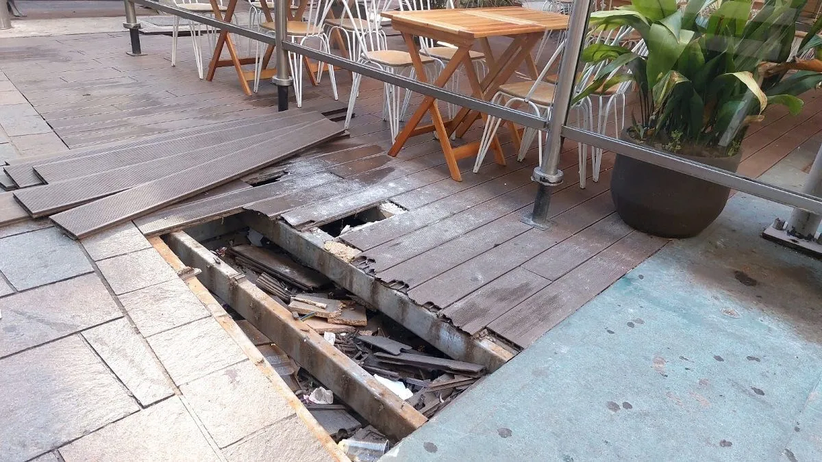 El sector afectado presenta un piso compuesto por listones de PVC símil madera, una estructura parecida a la de un deck que se repite a lo largo de todo el paseo comercial.