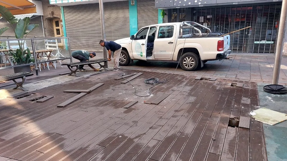 Personal del Ente Municipal de Servicios Urbanos (EMSUR) lleva adelante desde esta mañana tareas de reparación en la Peatonal San Martín, en el sector donde una mujer de edad avanzada sufrió una caída y resultó lesionada.