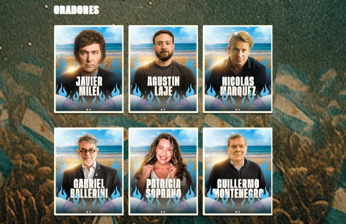 En la imagen principal del sitio online, aparecen el presidente Javier Milei, Nicolás Marquez, Agustin Laje, Guillermo Montenegro,  Sergio Figliuolo, Lilia Lemoine, Patricia Soprano y Gabriel Ballerini, quienes serán los oradores del evento.