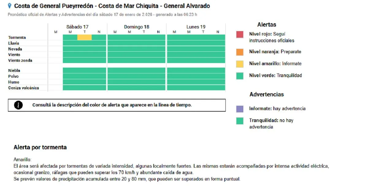 Según se sostiene, el área comprendida por la costa de la ciudad, así como Mar Chiquita y Miramar, será afectada por tormentas de variada intensidad, algunas localmente fuertes.