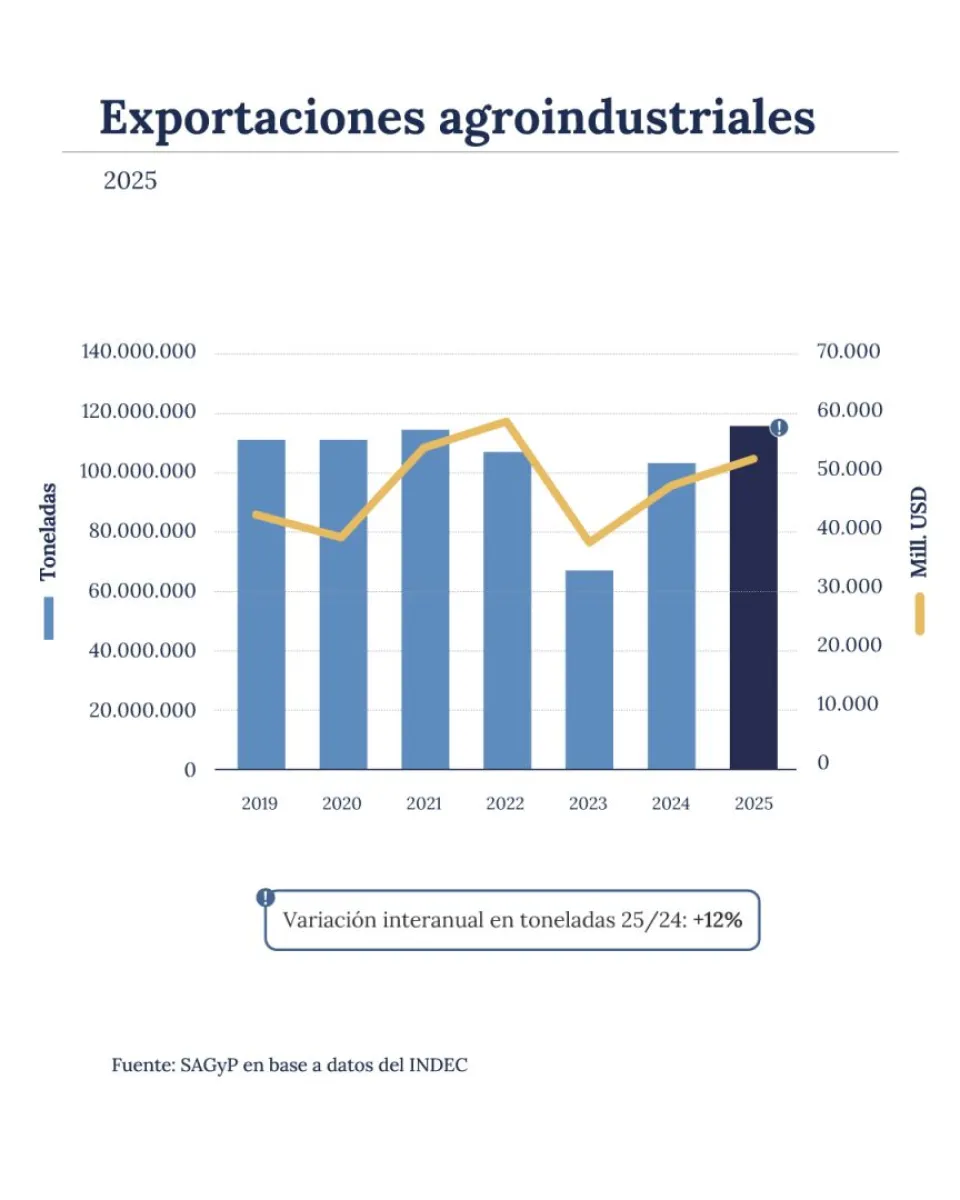En 2025, las exportaciones agroindustriales argentinas alcanzaron un hito sin precedentes, con 115,41 millones de toneladas exportadas, un 12% más que en 2024, según la Secretaría de Agricultura, Ganadería y Pesca.