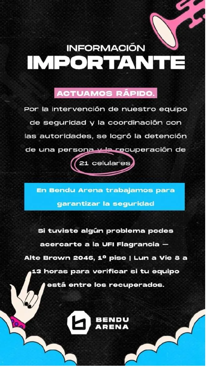 Desde Bendu Arena se destacó la pronta intervención de personal de Seguridad de la organización para avanzar hacia el esclarecimiento de este caso. Quienes allí sufrieron robo de su teléfono están convocados a pasar por primer piso Tribunales, de 8 a 13, reconocer equipos y recuperar el propio si está entre este lote de secuestros.