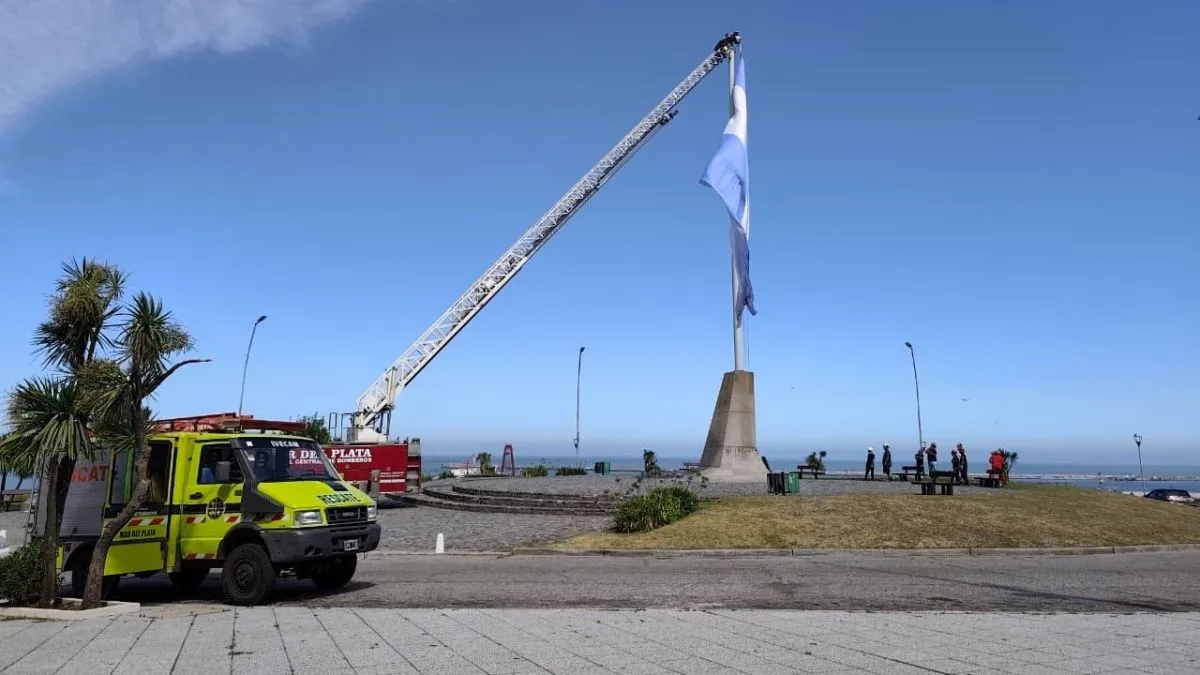 La bandera ubicada en la rotonda del Golf de Mar del Plata se enredó y demandó el montaje de un operativo. Dos dotaciones de bomberos trabajaron en el lugar para devolver el símbolo patrio a su posición original, luego de que se viera afectado por las adversas condiciones climáticas registradas el lunes.