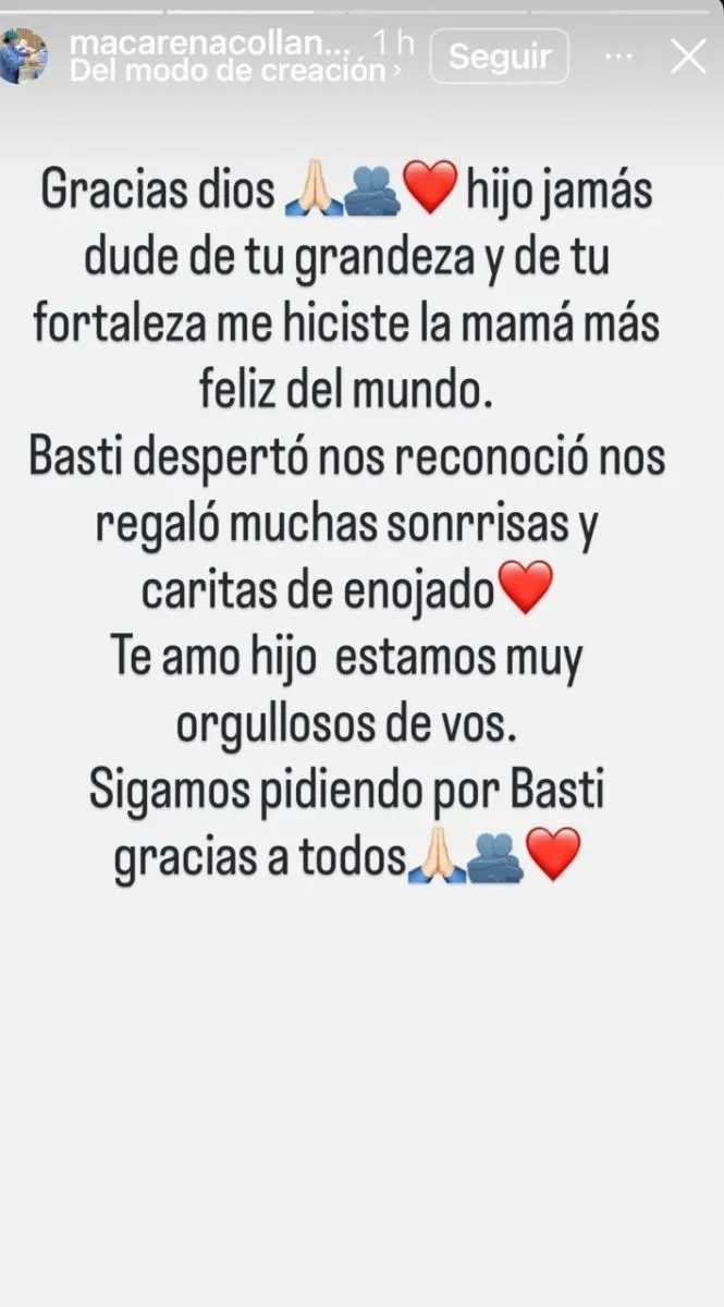 “Te amo hijo, estamos muy orgullosos de vos”, publicó Macarena Collantes en lo que representa el último dato conocido sobre el estado de salud de este paciente que aquí permanece internado en el área de Cuidados Intensivos del Hospital Interzonal Especializado Materno Infantil (Hiemi).