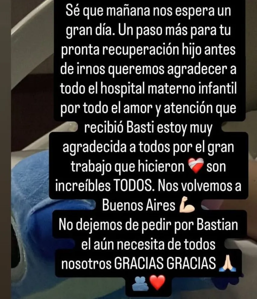 "Queremos agradecer a todo el Hospital Materno Infantil por todo el amor y atención que recibió Basti. Estoy muy agradecida a todos por el trabajo que hicieron. Son increibles", destacó Macarena Collantes.