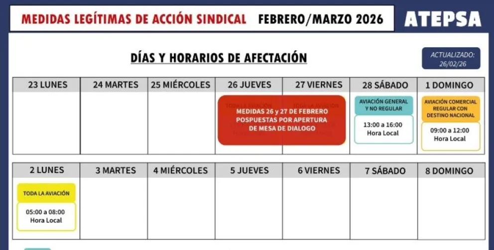 La Asociación Técnicos y Empleados de Protección y Seguridad a la Aeronavegación (ATEPSA) confirmó que avanzaron en una mesa de diálogo con el objetivo de continuar las negociaciones. Ante esto, se levantaron los paros de este jueves 26 y viernes 27 de febrero.