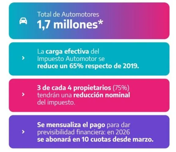 La alícuota mínima baja de 3,64% a 1%, mientras que la alícuota máxima se reduce de 5% a 4,5%. Según datos oficiales, la carga efectiva del Impuesto Automotor será del 1,9%, lo que representa una disminución del 65% respecto de 2019.