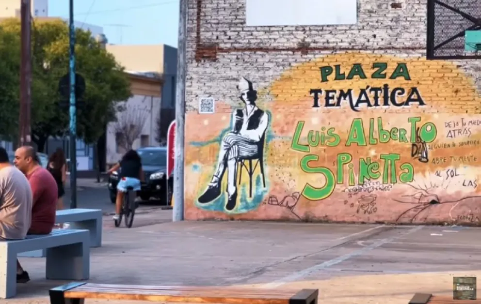 Se trata de ni más ni menos que un reloj, como un homenaje a Luis Alberto Spinetta,  un artefacto que simula una nave espacial, que mide unos cuatro metros de alto por unos tres y medio de ancho. Está colgada a unos cuatro metros en una de las paredes de la plaza temática que homenajea al músico y  tiene una particularidad: a cada hora en punto gira una cuerda, se abre la escotilla principal de la nave y se lo ve al autor de “Muchacha ojos de papel” moviendo una mano y una pierna y girando alrededor de él un aro con las tapas de sus discos.