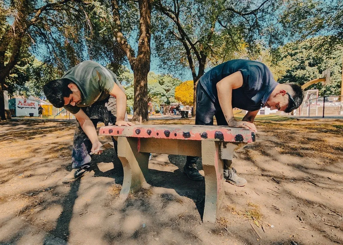 Las acciones incluyeron la puesta en valor del mobiliario urbano, con trabajos de pintura en bancos, mástil y juegos infantiles, reparación de hamacas y calesita, restauración de tableros de básquet y pintura del edificio donde funciona la biblioteca del espacio.