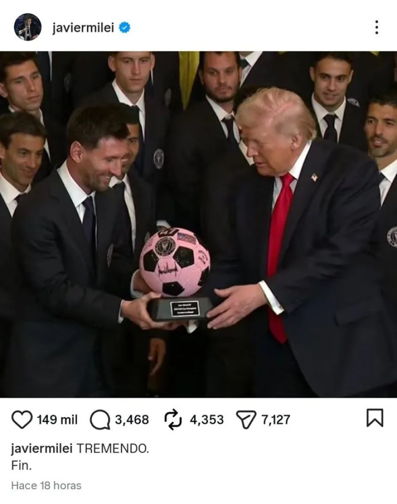 Ese encuentro fue celebrado por Javier Milei con al menos dos publicaciones en Instagram. La primera fue una foto del capitán argentino con el presidente norteamericano con la leyenda: "TREMENDO. Fin".