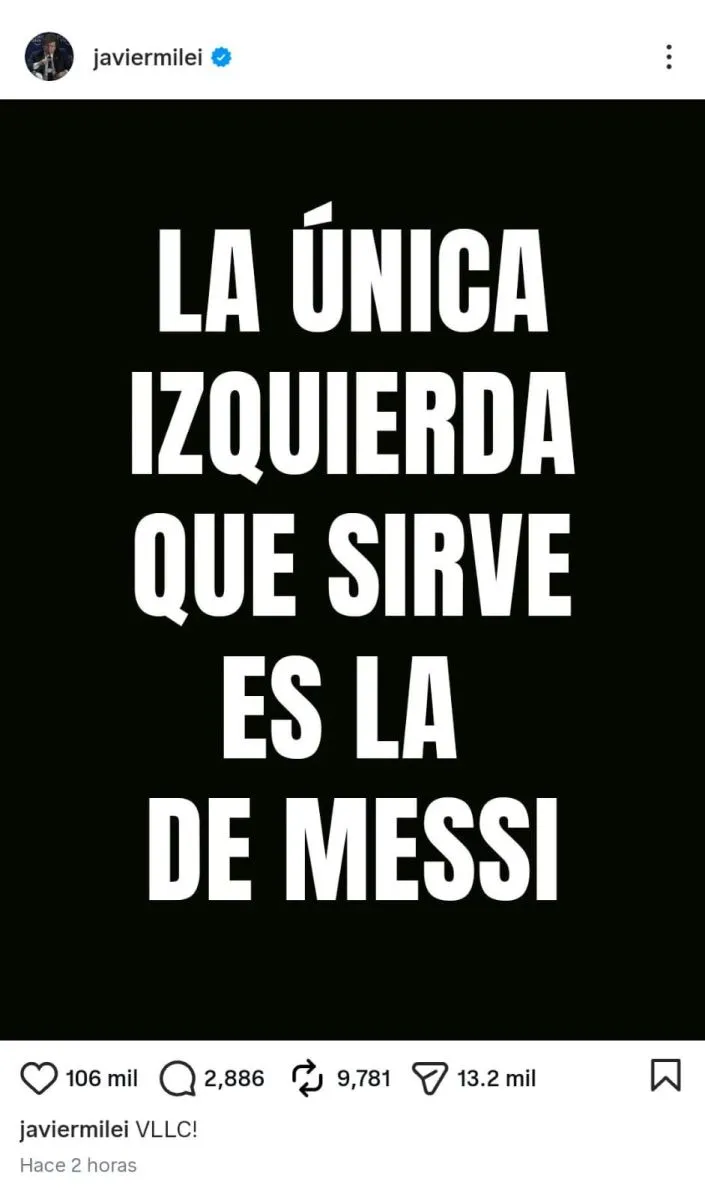 Este viernes el mandatario argentino hizo otro posteo en la misma red social con halagos para el campeón del mundo y dándole una fuerte crítica a parte de la oposición política: "LA ÚNICA IZQUIERDA QUE SIRVE ES LA DE MESSI", escribió en letras mayúsculas blancas sobre un fondo negro.