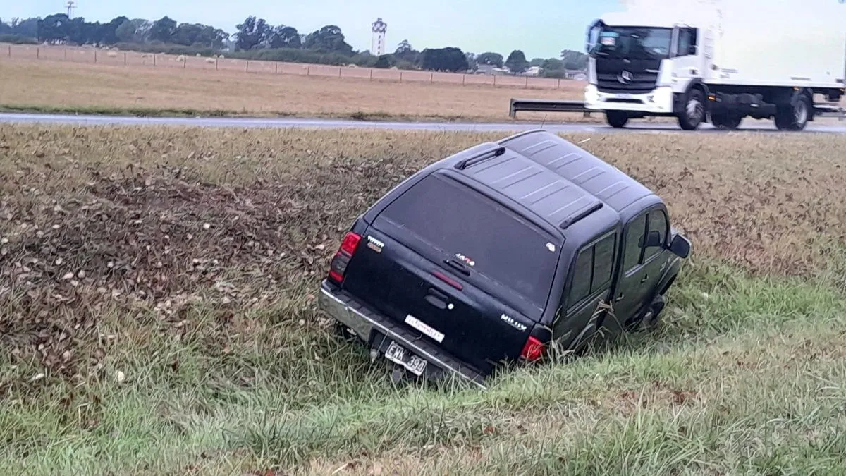 Tras el despiste, la camioneta descendió hacia el cantero central, donde el terreno presenta una pendiente pronunciada. Esa característica impidió que el vehículo atravesara hacia la calzada contraria y provocó que quedara encajado en el lugar. El pasto mojado también debe haber hecho su contribución para  impedir su regreso a la cinta asfáltica.
