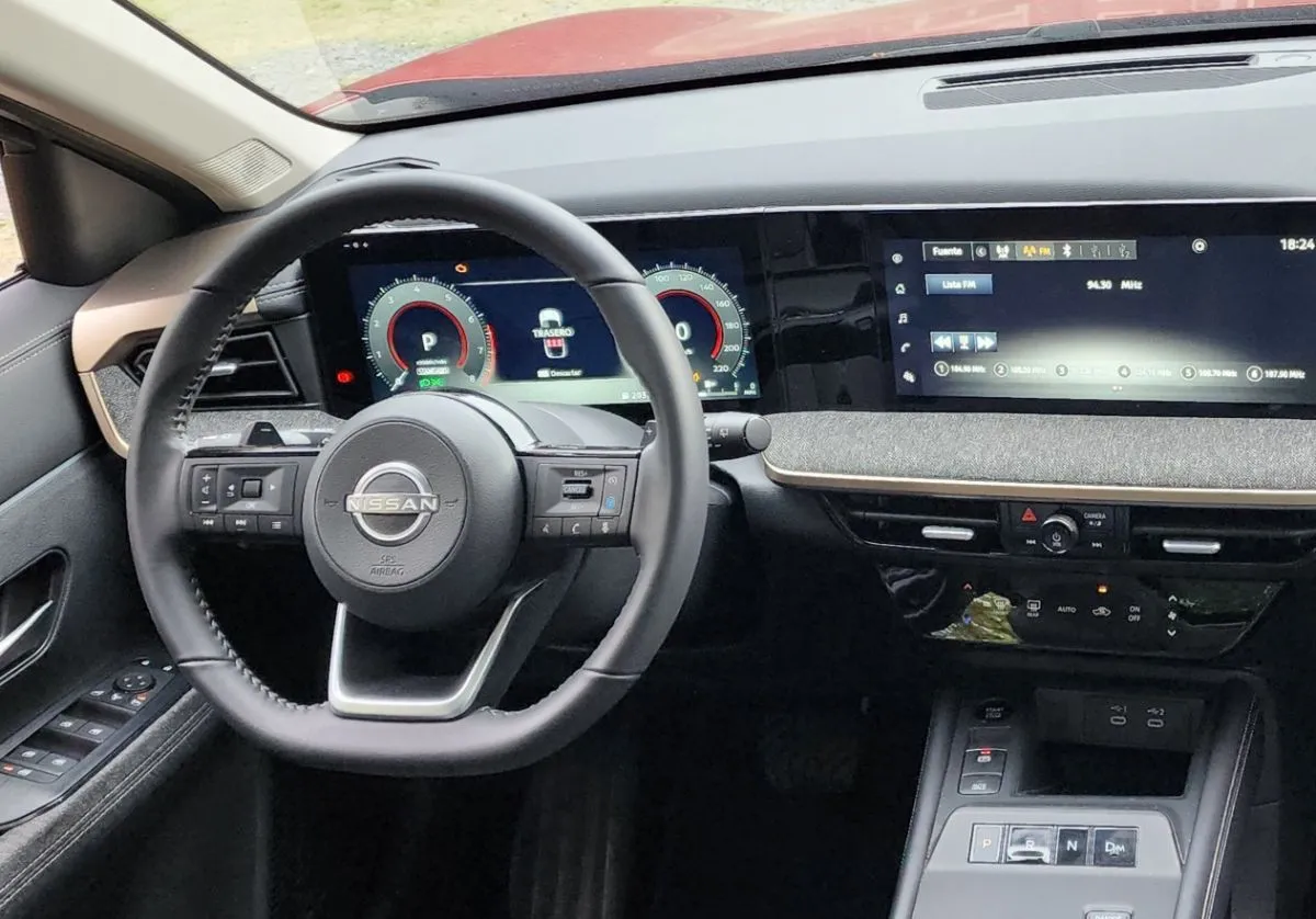 Donde también los cambios se notan, y mucho, es en el interior. Pero allí creo que no hay discusión y todos son elogios. Confeccionado con materiales de buena calidad, y abundancia de los que son blandos, se corona con elegancia al revestirse buena parte de los paneles frontal y de puertas, con una tela oscura similar al jean. Las butacas de cuero ecológico son cómodas, aunque con regulación manual. Un gigantesco techo panorámico de dos cuerpos le hace honor a la denominación en japonés de otro modelo exitoso de Nissan, el Tiida, que significa sol. Lleva dos pantallas de algo más de 12 pulgadas, que ofician de tablero con cuadrantes de relojes que emulan las agujas y de sistema multimedia para el comando de las funciones, que en el caso de la climatización se complementa con teclas táctiles. El audio es envolvente, de excelente calidad como lo garantizan los equipos Bose, que en este caso lleva 10 parlantes, incluidos los que van en los apoyacabezas delanteros. El vehículo es muy cómodo para acceder y viajar en las 5 plazas, y además es muy amplio en su baúl plano de doble altura, con una capacidad de 470 litros que alberga un auxilio temporal.