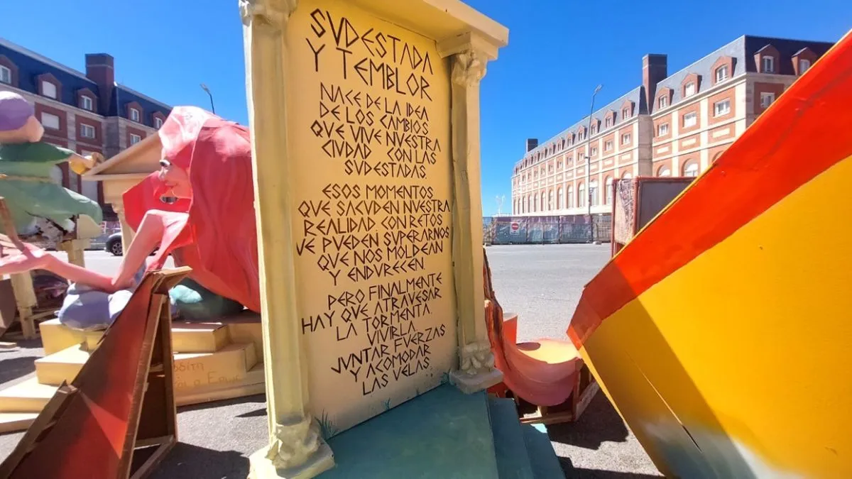 También hay un Caballo de Troya, parte de una ballena, Cupido y una lanchita amarilla. Este año no se observan caricaturas de políticos como sí ocurrió en ediciones anteriores. Además, se ve una pancarta con un texto motivador: "Sudestada y temblor nace de la idea de los cambios que vive nuestra ciudad con las sudestadas. Esos momentos que sacuden nuestra realidad con retos que pueden superarnos, que nos moldean y endurecen, pero finalmente hay que atravesar la tormenta, vivirla, juntar fuerzas y acomodar las velas".