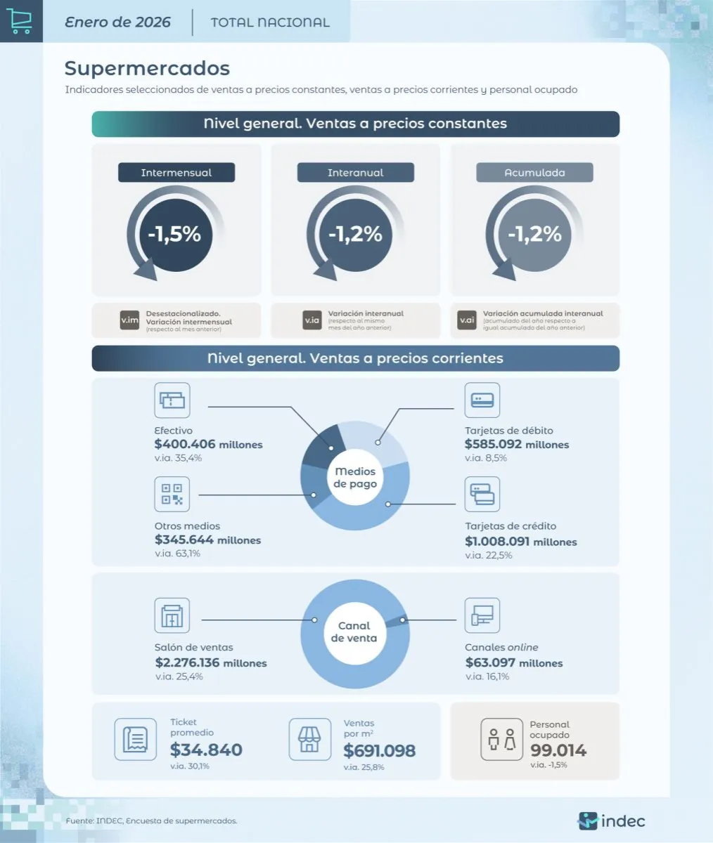 De acuerdo con el informe oficial, las ventas en supermercados registraron una baja del 1,2% interanual, mientras que en la comparación con diciembre de 2025 se observó una caída del 1,5% en términos mensuales.