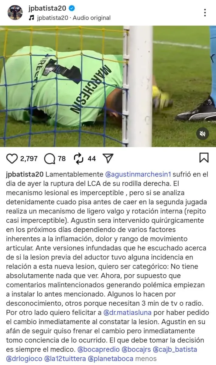 Jorge Batista, médico de Boca Juniors, confirmó que el arquero Agustín Marchesín sufrió la rotura del ligamento cruzado anterior (LCA) de la rodilla derecha. El doctor explicó que "el mecanismo lesional es imperceptible, pero si se analiza detenidamente, cuando pisa antes de caer en la segunda jugada, realiza un mecanismo de ligero valgo y rotación interna".