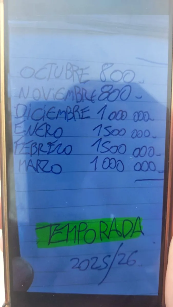 Mostró a Radio Brisas un papel donde consta que pagó 800.000 pesos por abril, igual que en octubre y noviembre. En diciembre y marzo 1.000.000 y en enero y febrero 1.500.000. "Iba pagando como podía y terminado el mes lo tenía pago", contó.
